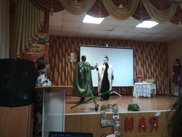 читали стихотворения, пели и инсценировали песни. Инсценировка песни "Баллада о матери" никого не оставила равнодушным. В завершение мероприятия весь зал исполнил хором песню "День Победы".